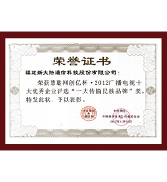榮獲2012廣播電視十大優(yōu)秀企業(yè)“十大傳輸民族品牌”(榮譽證書)