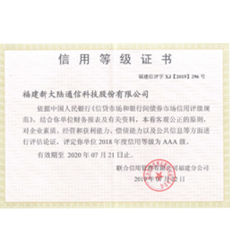 榮譽稱號榮獲《2019年度信用等級AAA證書》